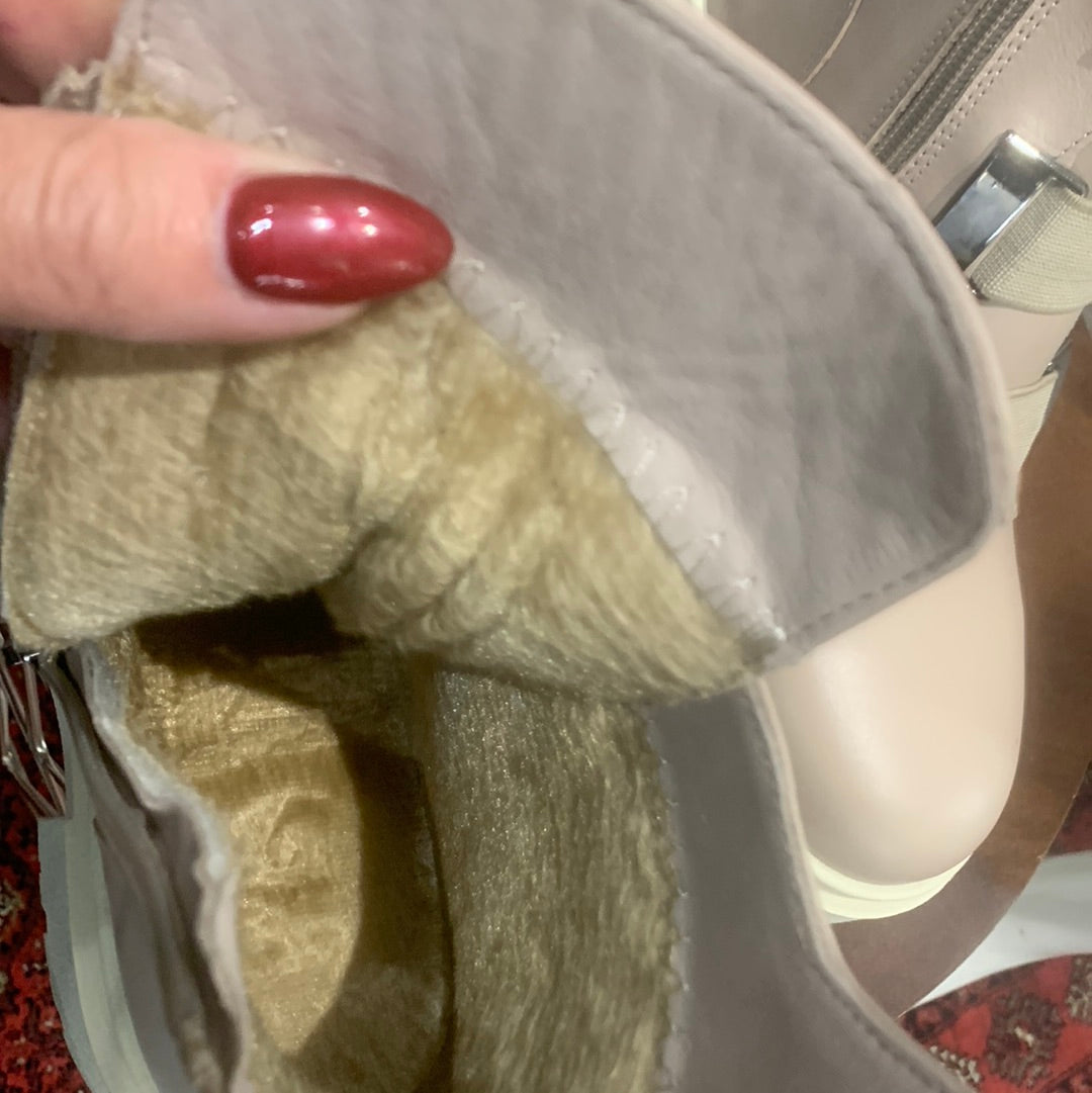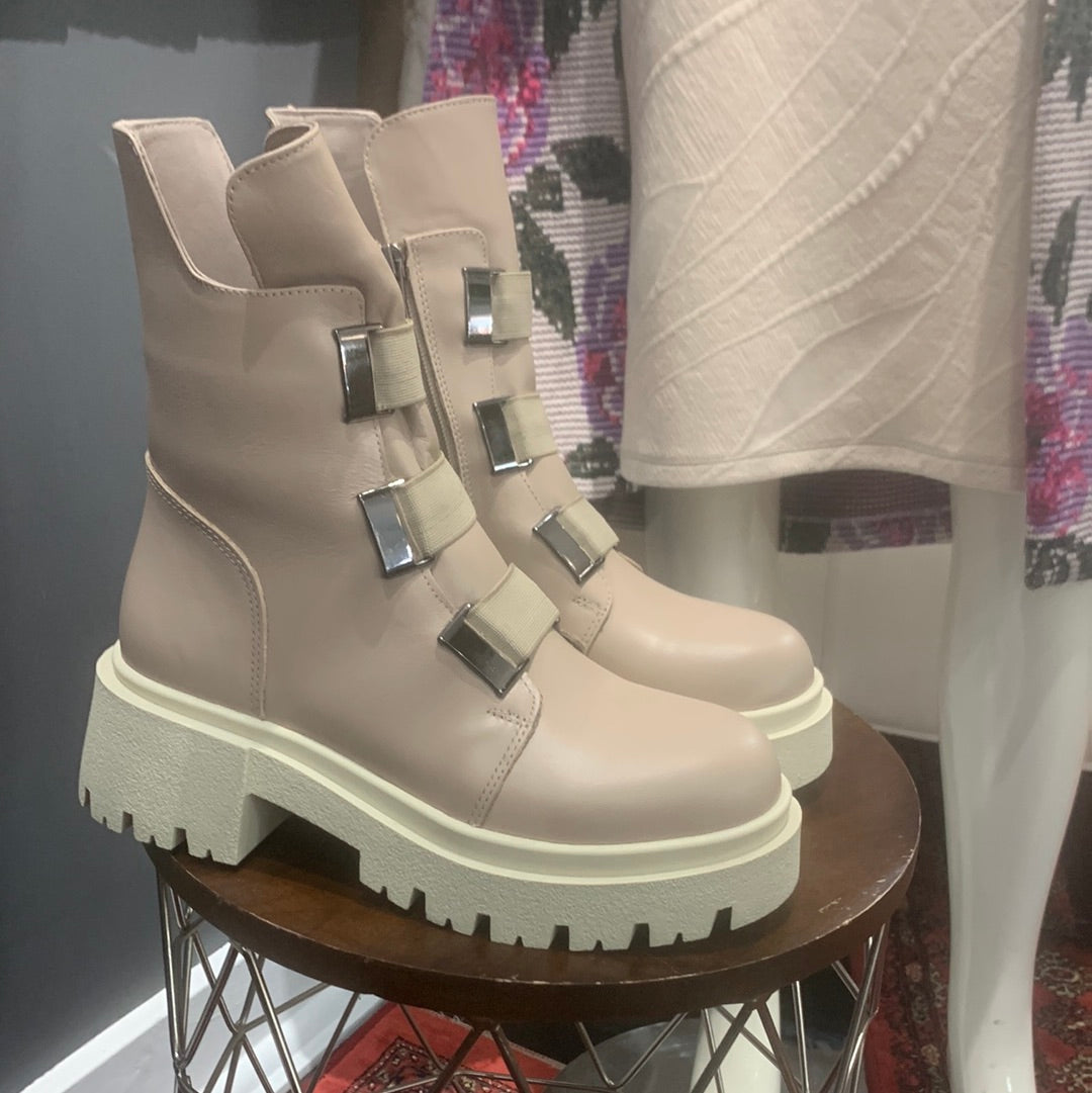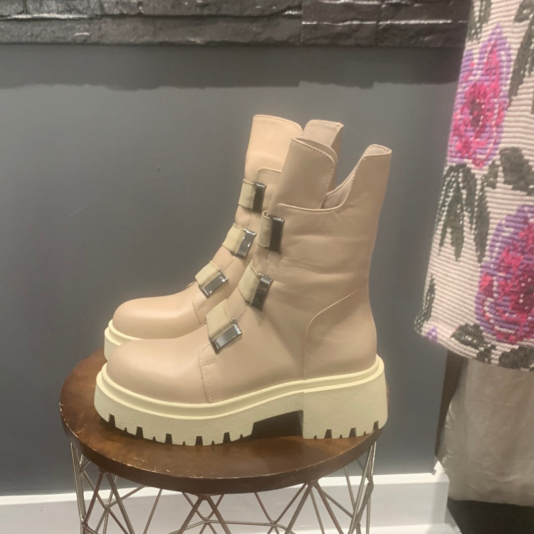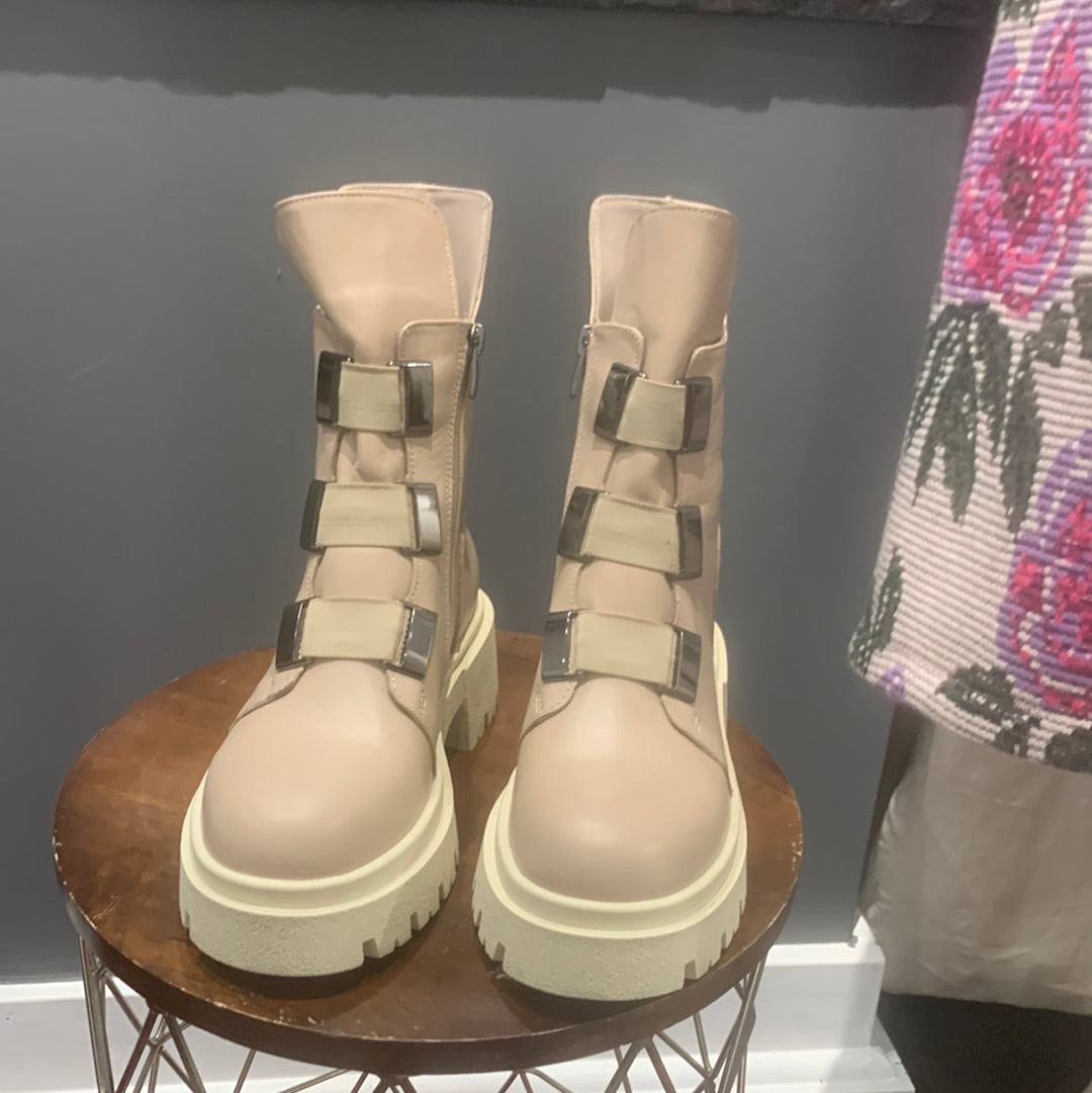 Soft leather combat style boot with silver detailing and side zip entry. Generous fit so consider sizing down one size.