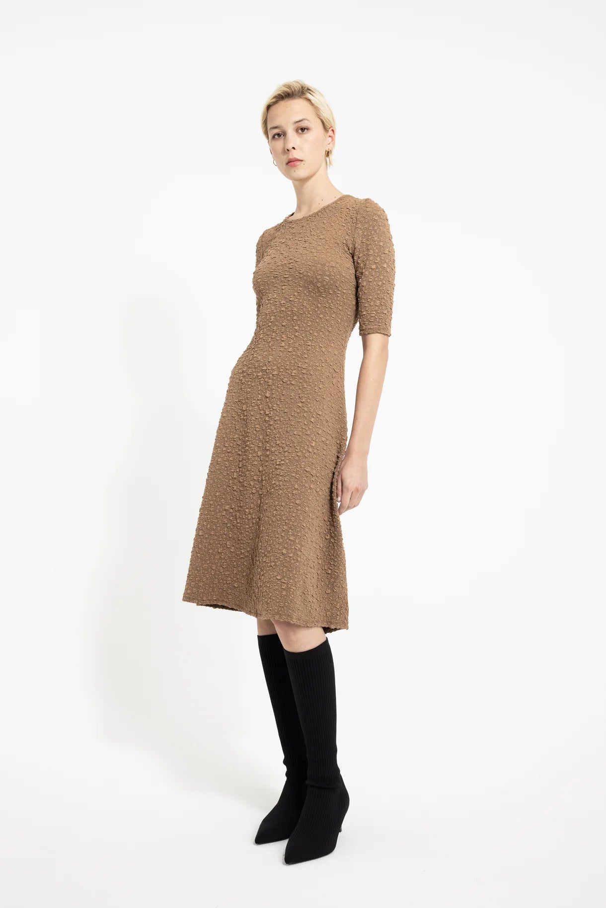 Meet KALI, our jacquard knit dress that redefines everyday elegance with ease. Crafted in the same camel-toned textured jacquard knit as our CONGO dress, KALI offers a fresh take with beautiful A-line cut. The raised textured knit adds depth and character to the minimalist silhouette, while its refined structure ensures both comfort and polish.