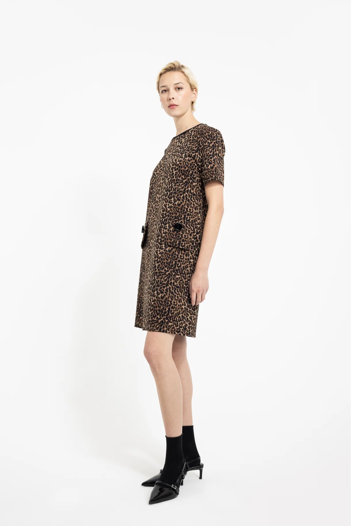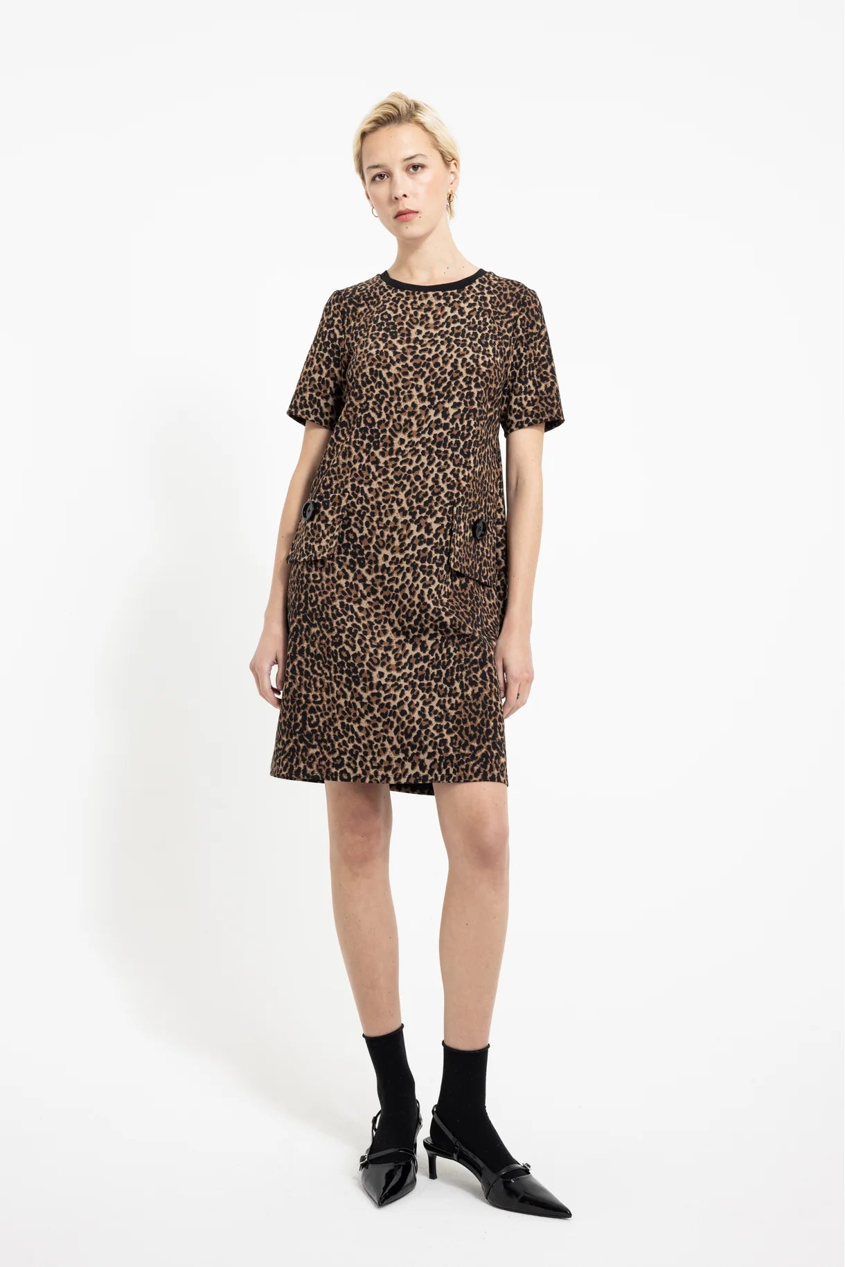 Cut in a structured stretch scuba with a modern leopard print, LUNA features a relaxed silhouette and flap pocket details with a contrasting black button for a touch of utility-chic. The short sleeves and contrast neckline elevate this piece from simple to striking—perfect for when you want ease without compromise.