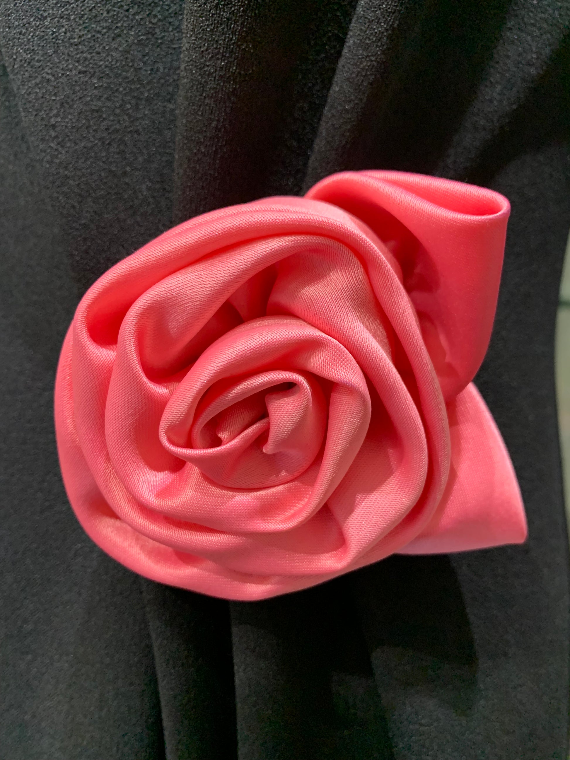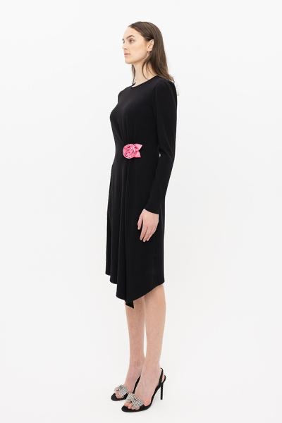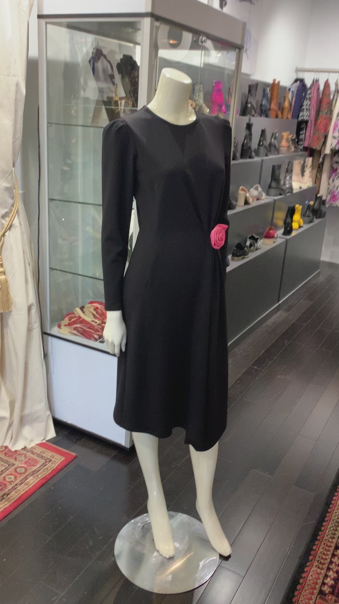 Featuring an asymmetrical hemline that flows beautifully with each stride, gathers at the shoulders for simple styling, and a rounded neckline with long sleeves, the Rosa dress is a versatile and timeless option for any event. Its black color and intricate pink rose design add a touch of elegance.