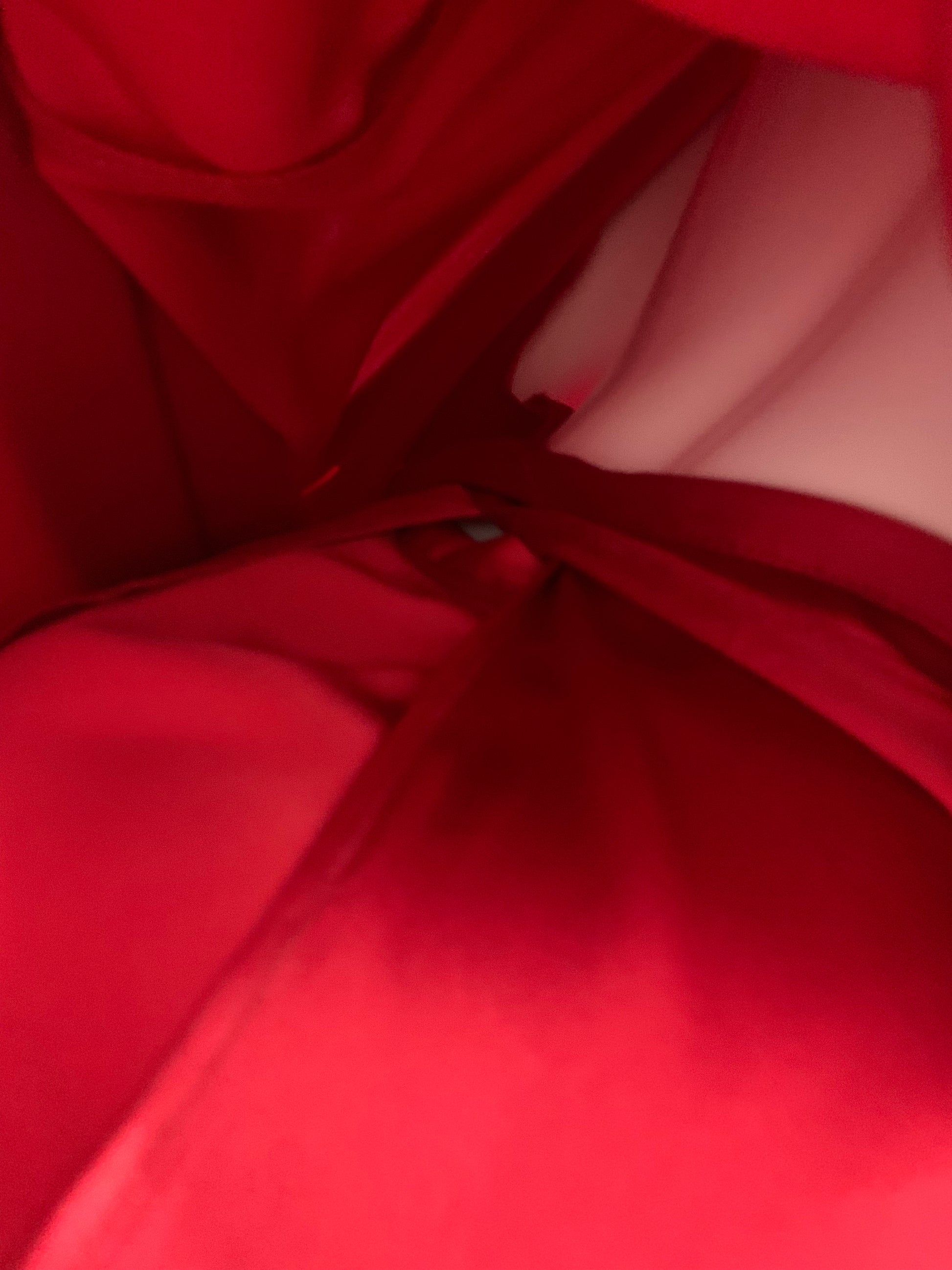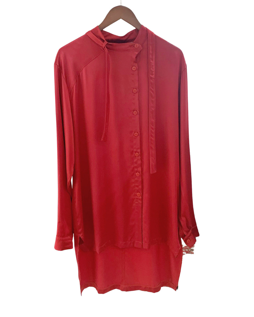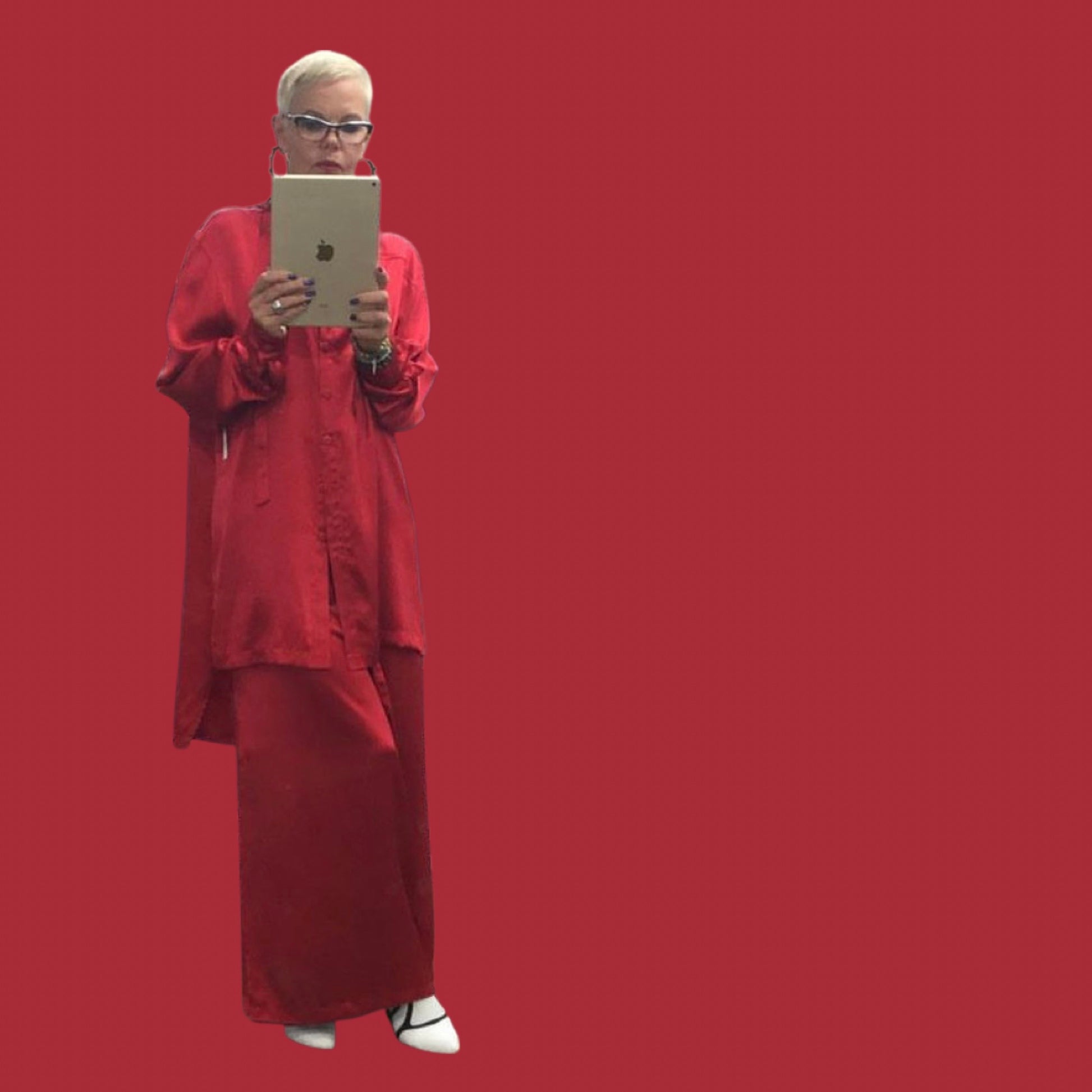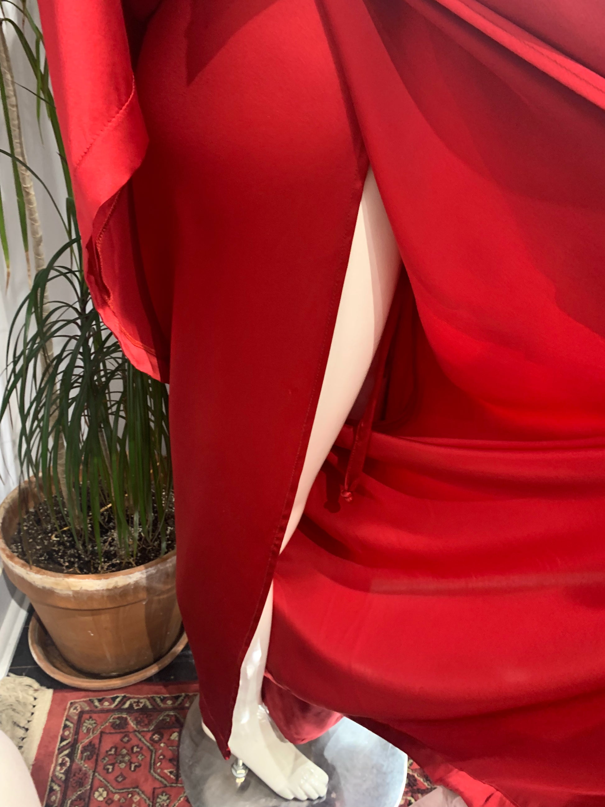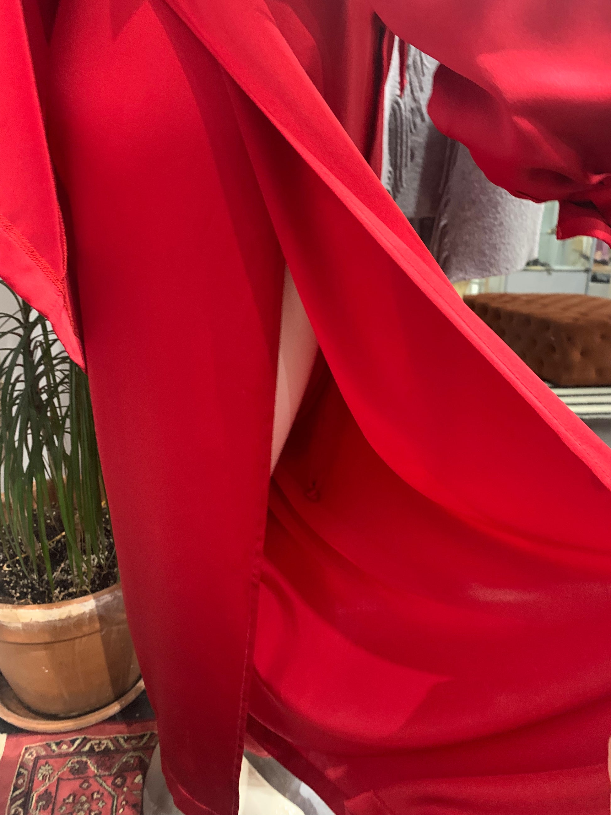 Red silk wrap pants.