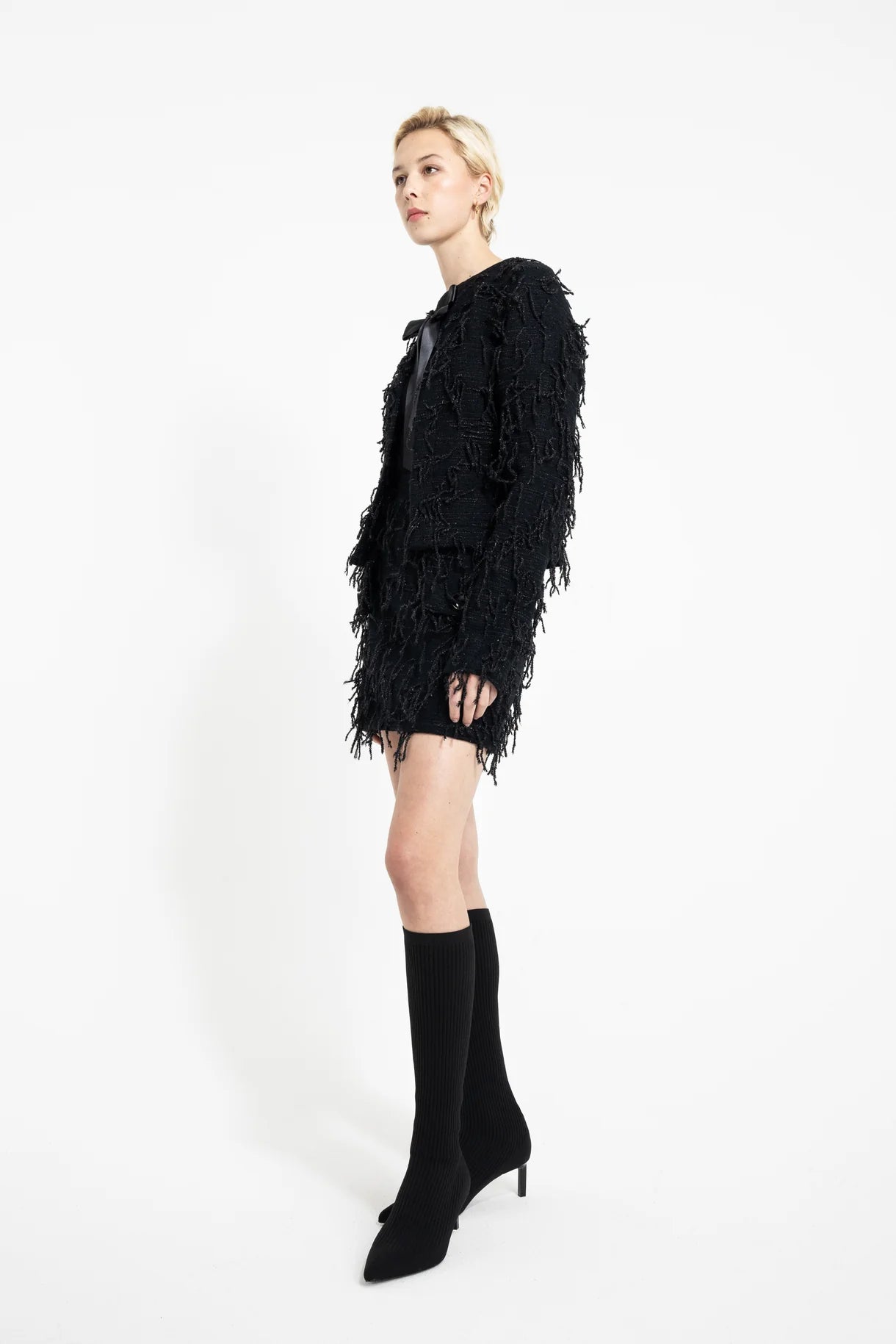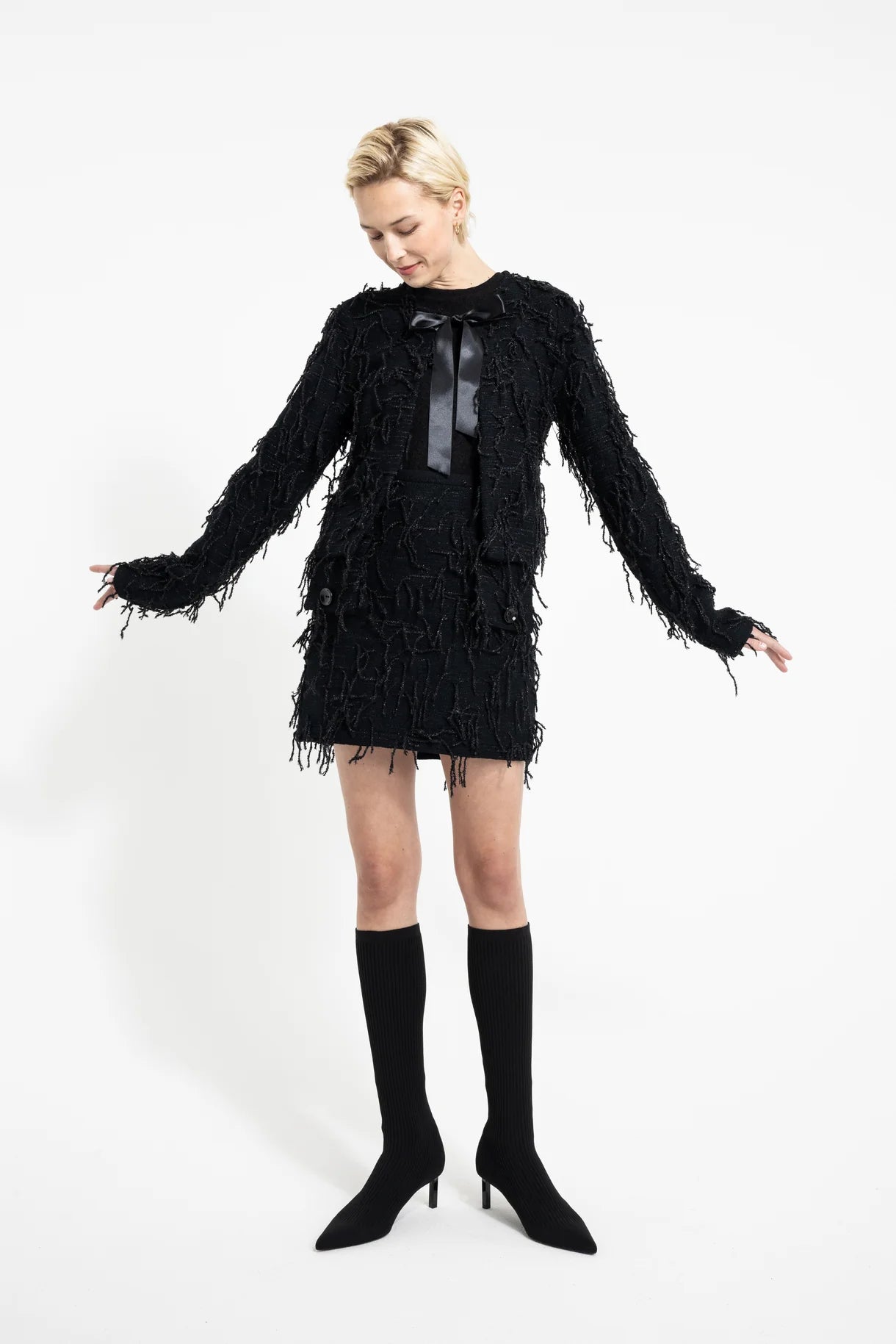 Cut at mid-thigh, TESSA takes a classic fitted silhouette and energizes it with the tactile dimension of fringed wool tweed. The raw-edge finish adds movement and edge, while the structured knit keeps the shape sharp and flattering. Playful yet polished, this skirt is made to bring confidence and style into your everyday wardrobe.
