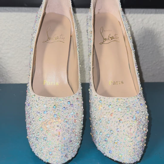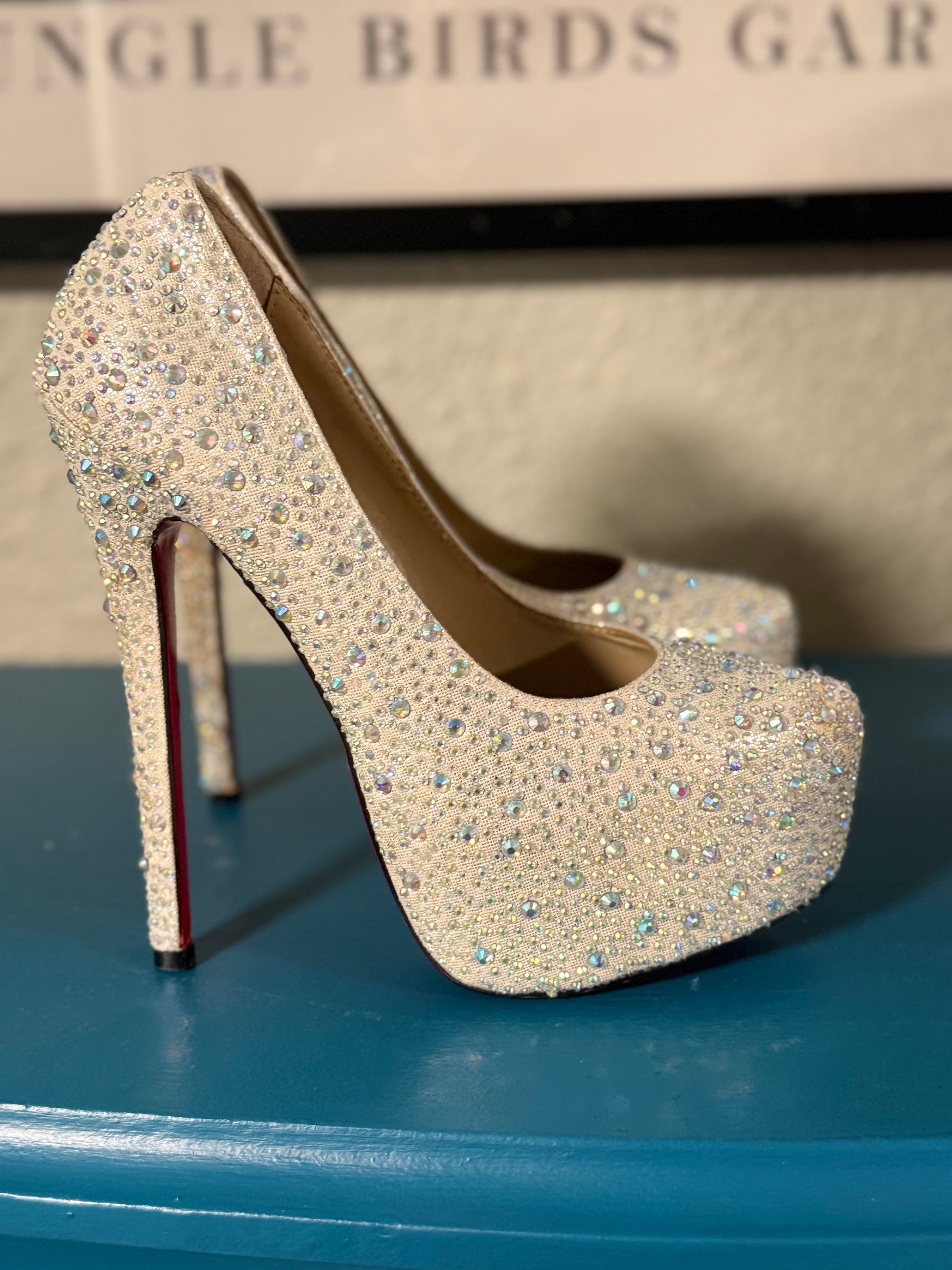 Christian Louboutin bedazzled pumps with a 2 inch platform and 6 inches heel and for their high platform, extreme heel height.